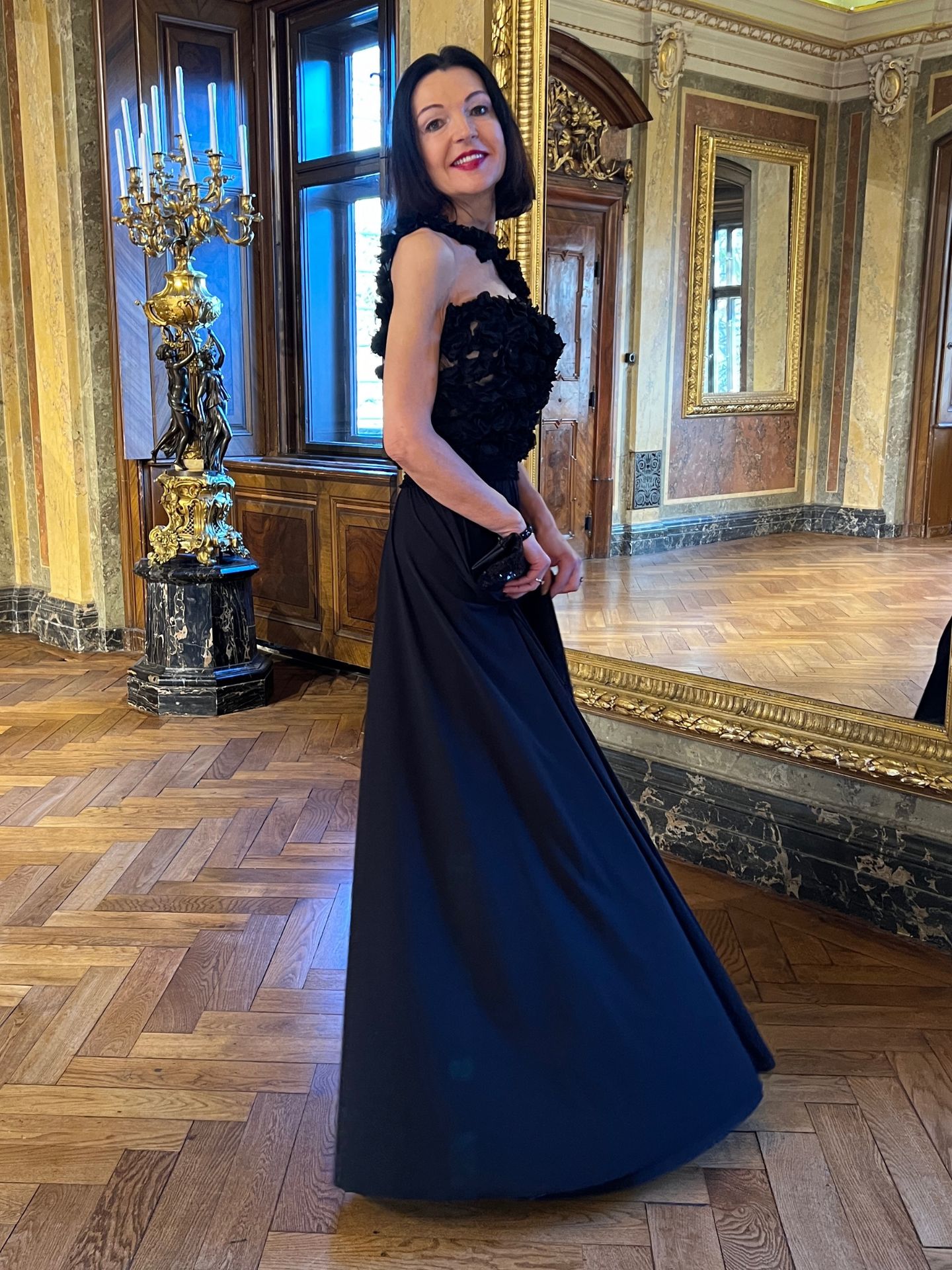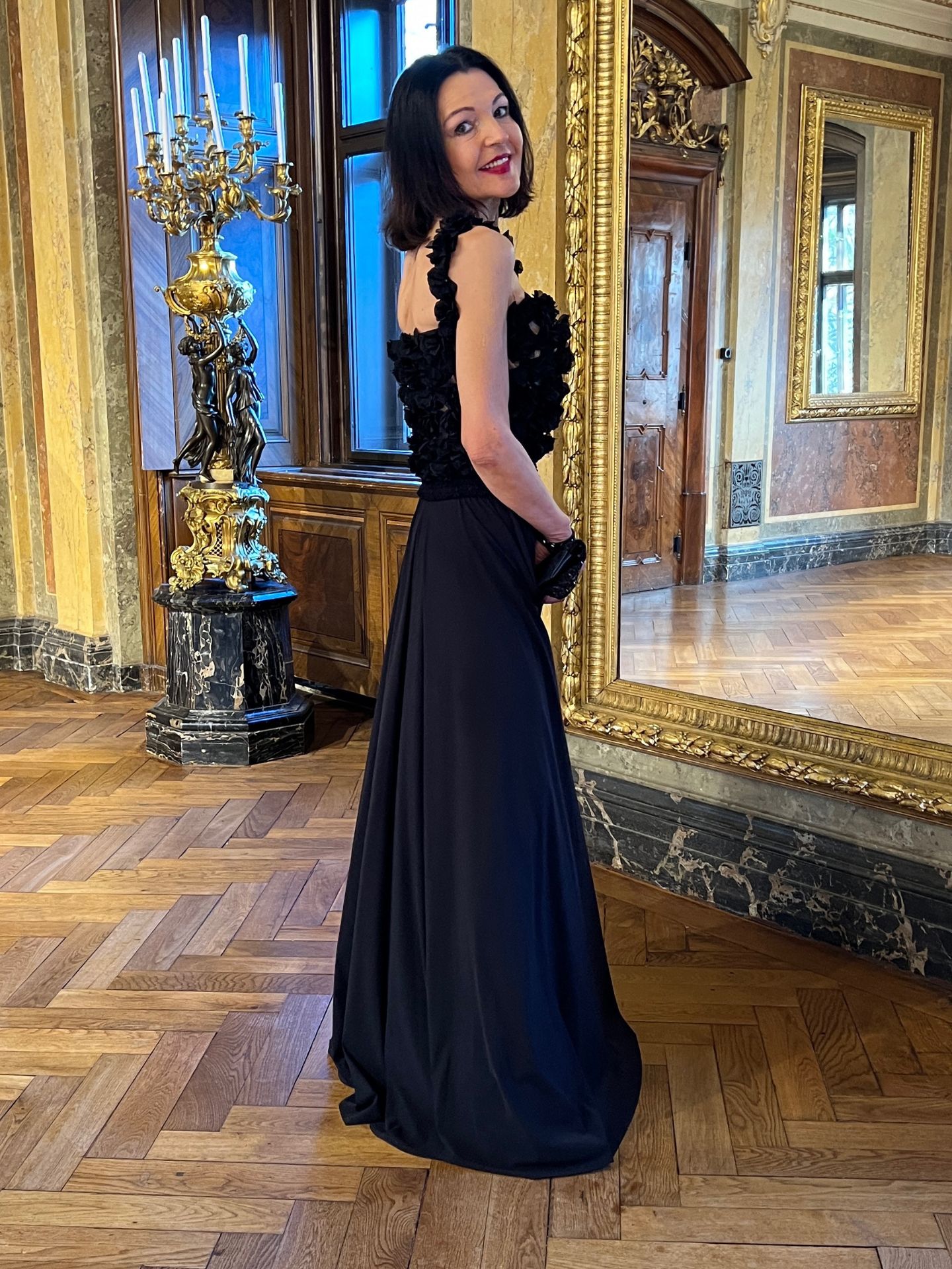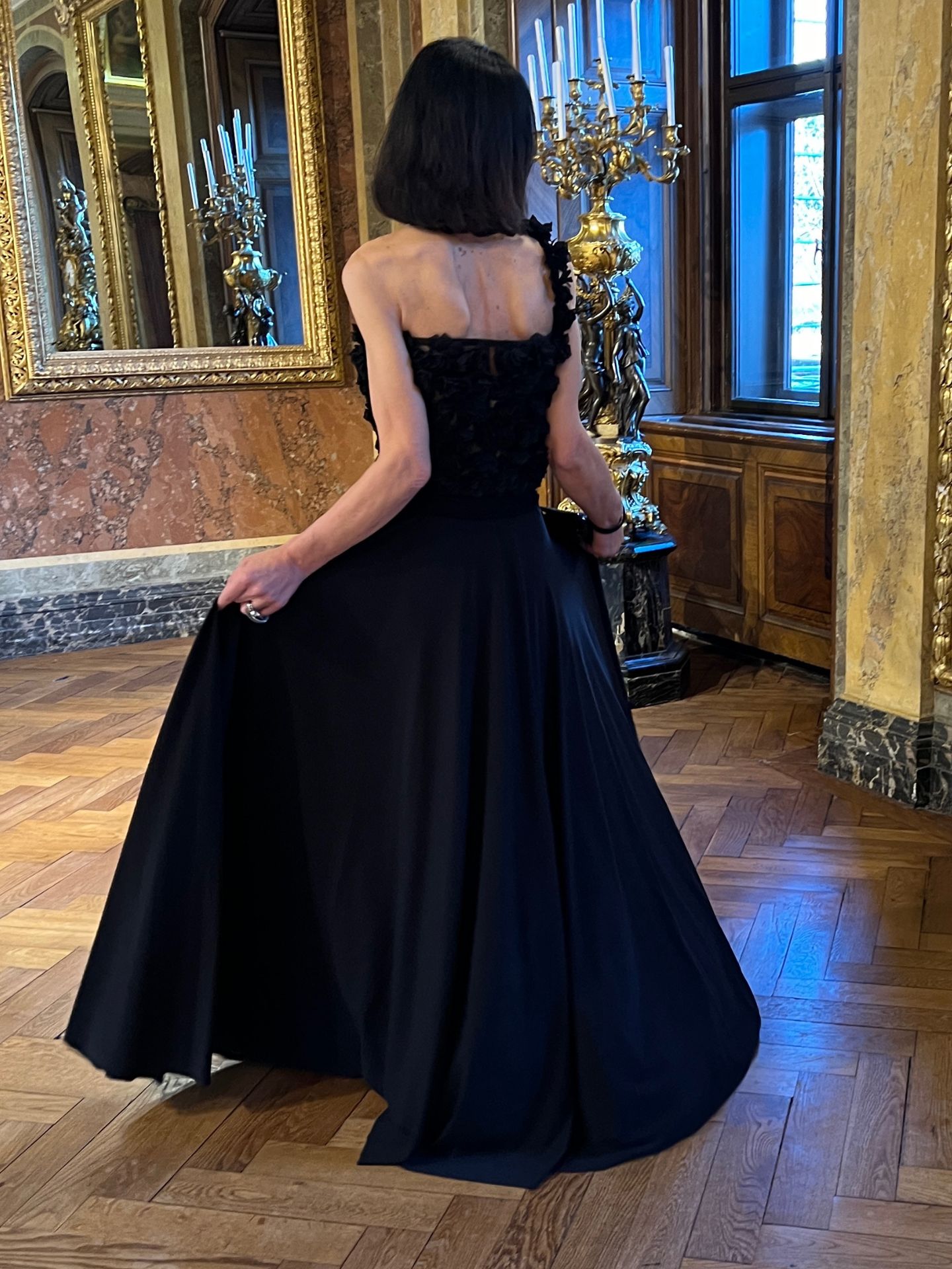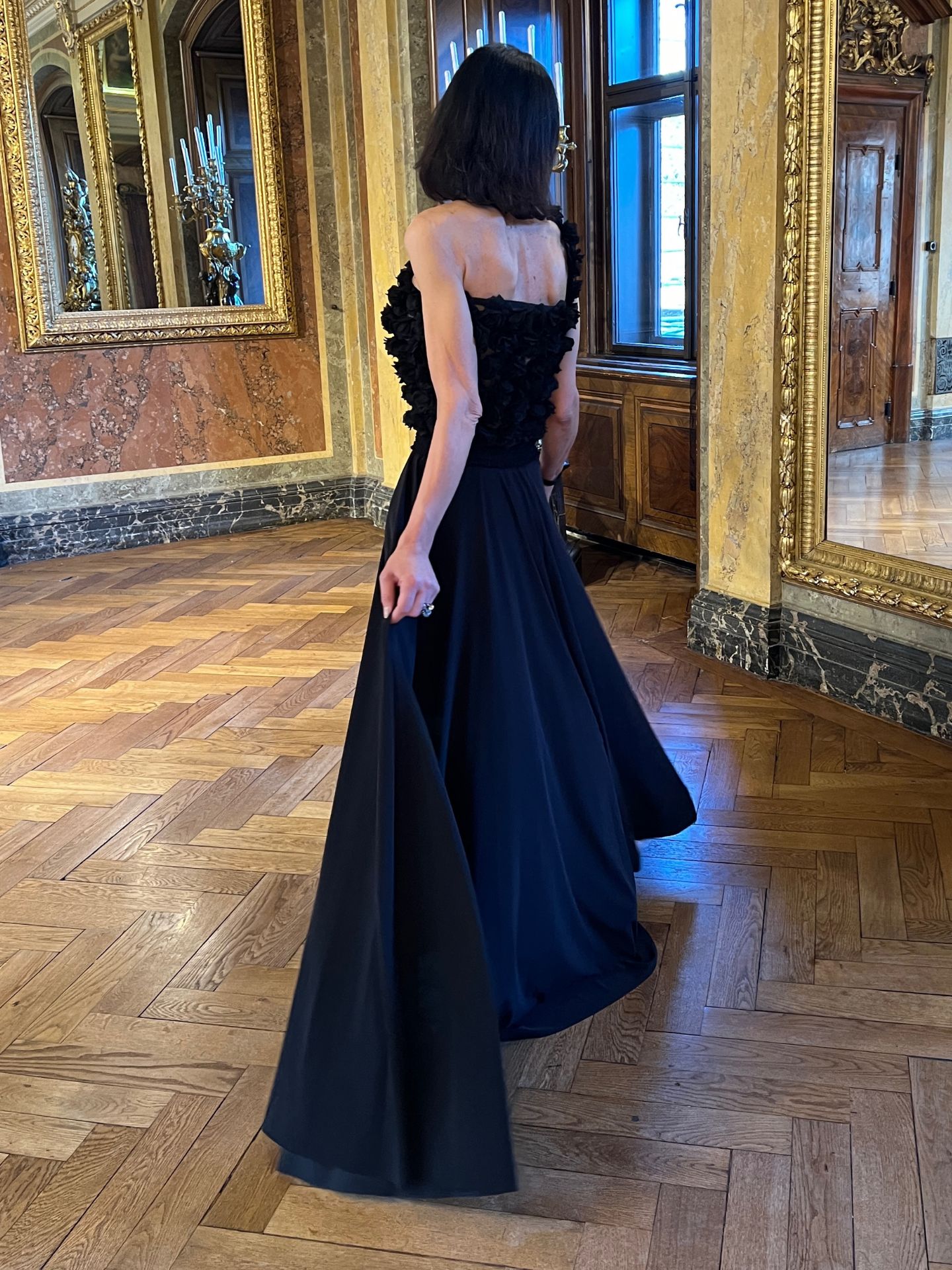 Das faszinierende schwarze lange Ballkleid strahlt zeitlose Raffinesse aus. Die elegante Silhouette und der subtile Glanz des Stoffes verleihen dem Kleid eine mysteriöse Eleganz, die bei jedem Schritt bewundernde Blicke auf sich zieht.
