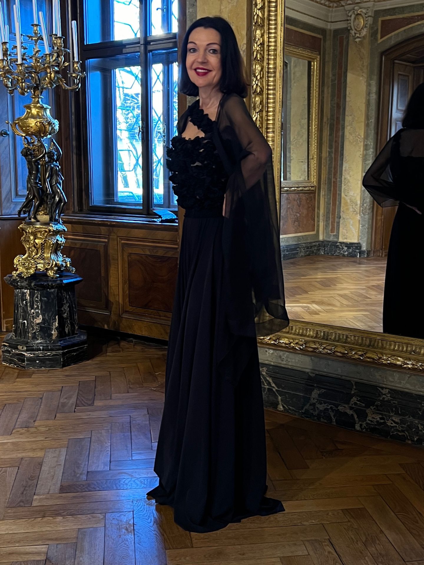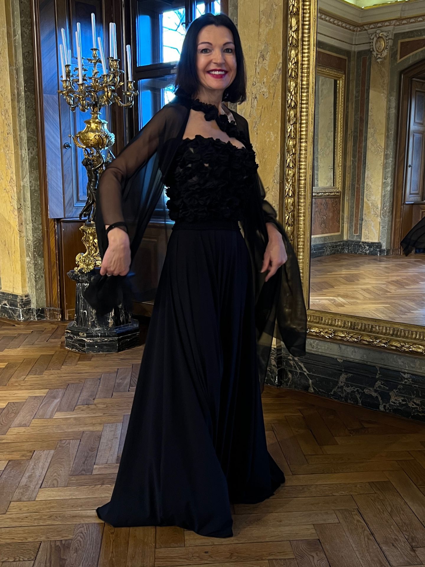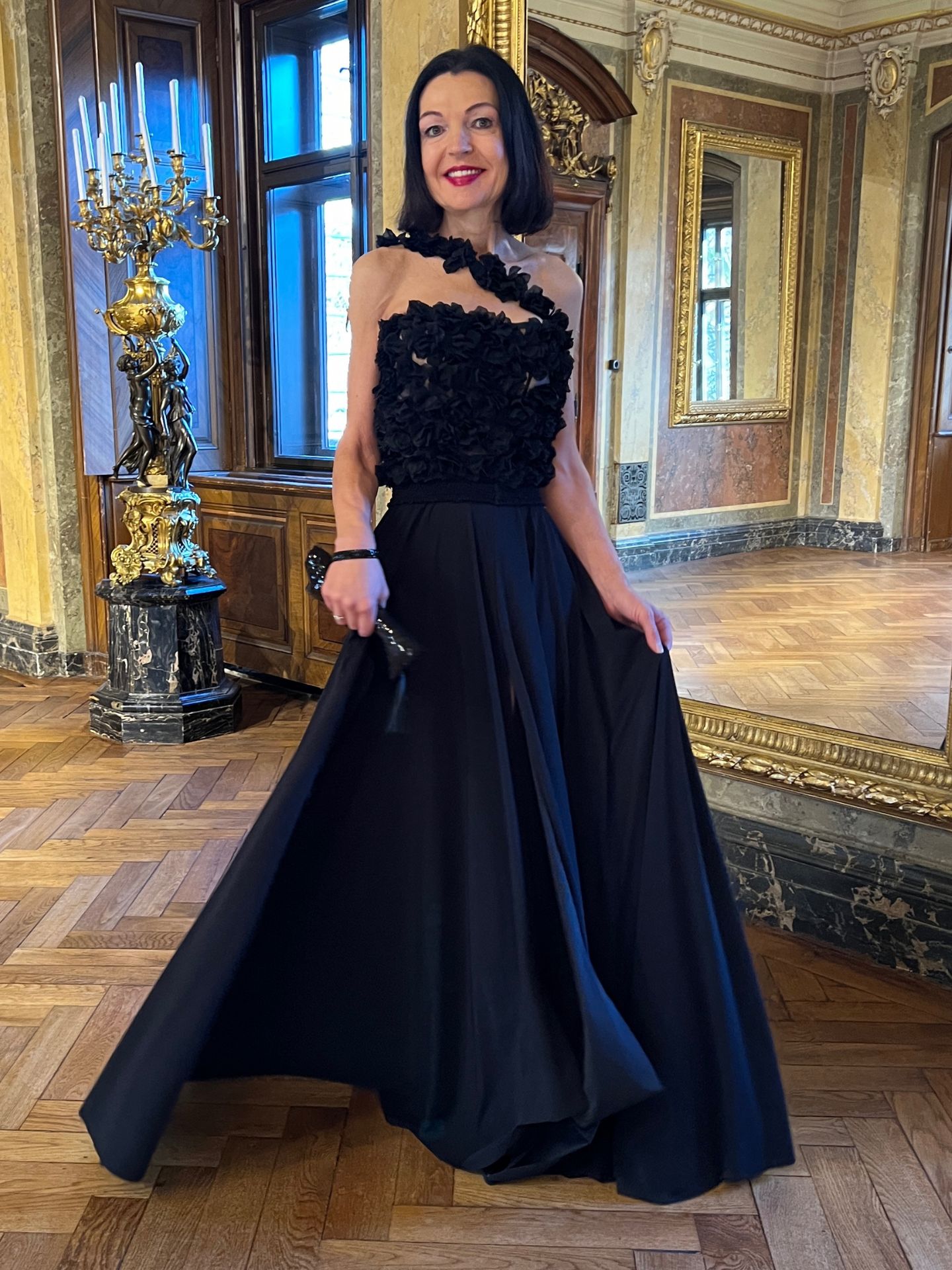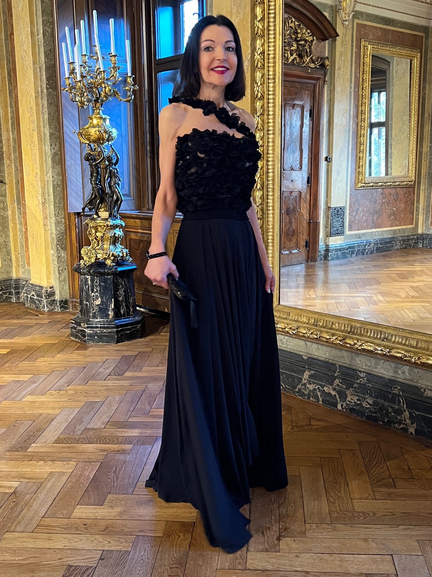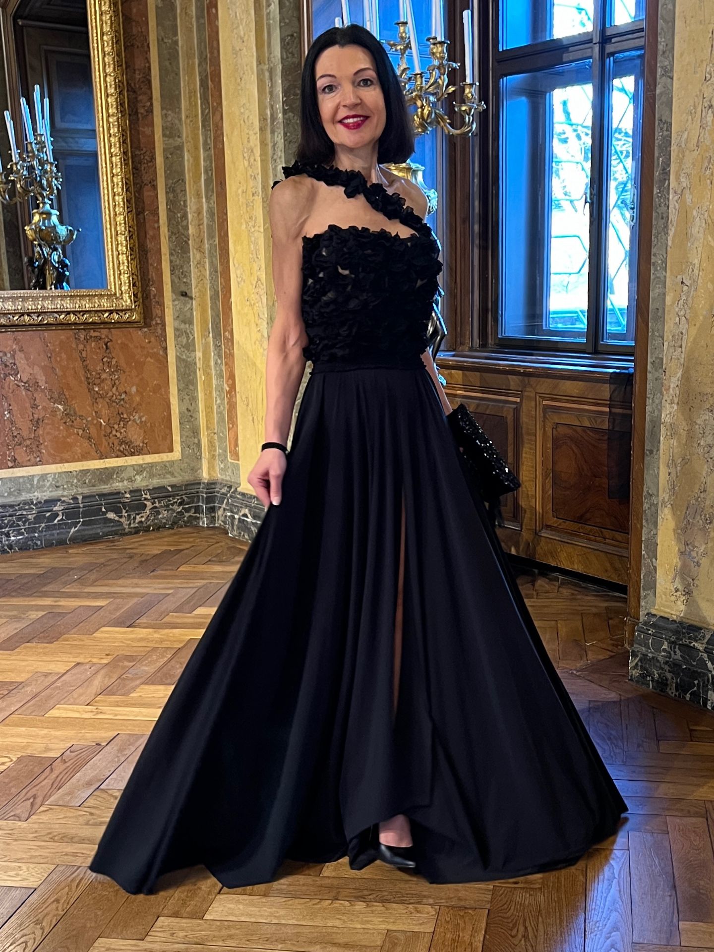 Das faszinierende schwarze lange Ballkleid strahlt zeitlose Raffinesse aus. Die elegante Silhouette und der subtile Glanz des Stoffes verleihen dem Kleid eine mysteriöse Eleganz, die bei jedem Schritt bewundernde Blicke auf sich zieht.