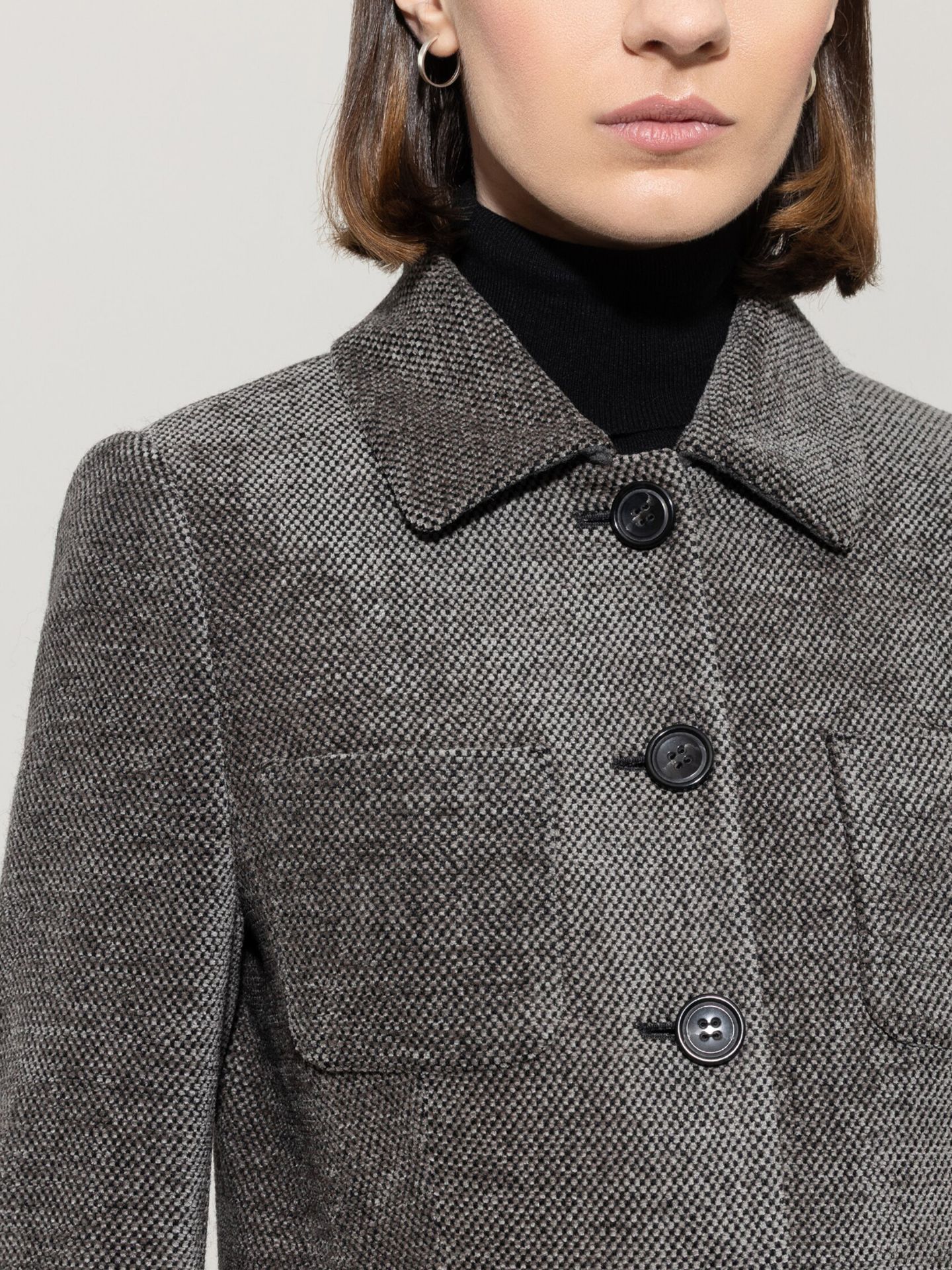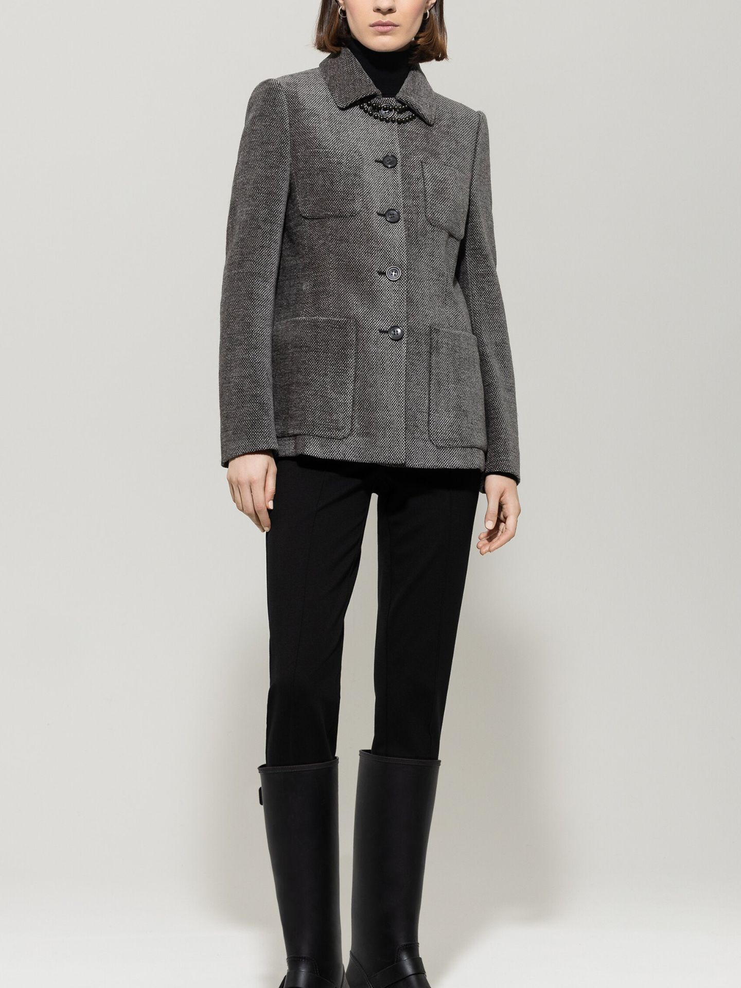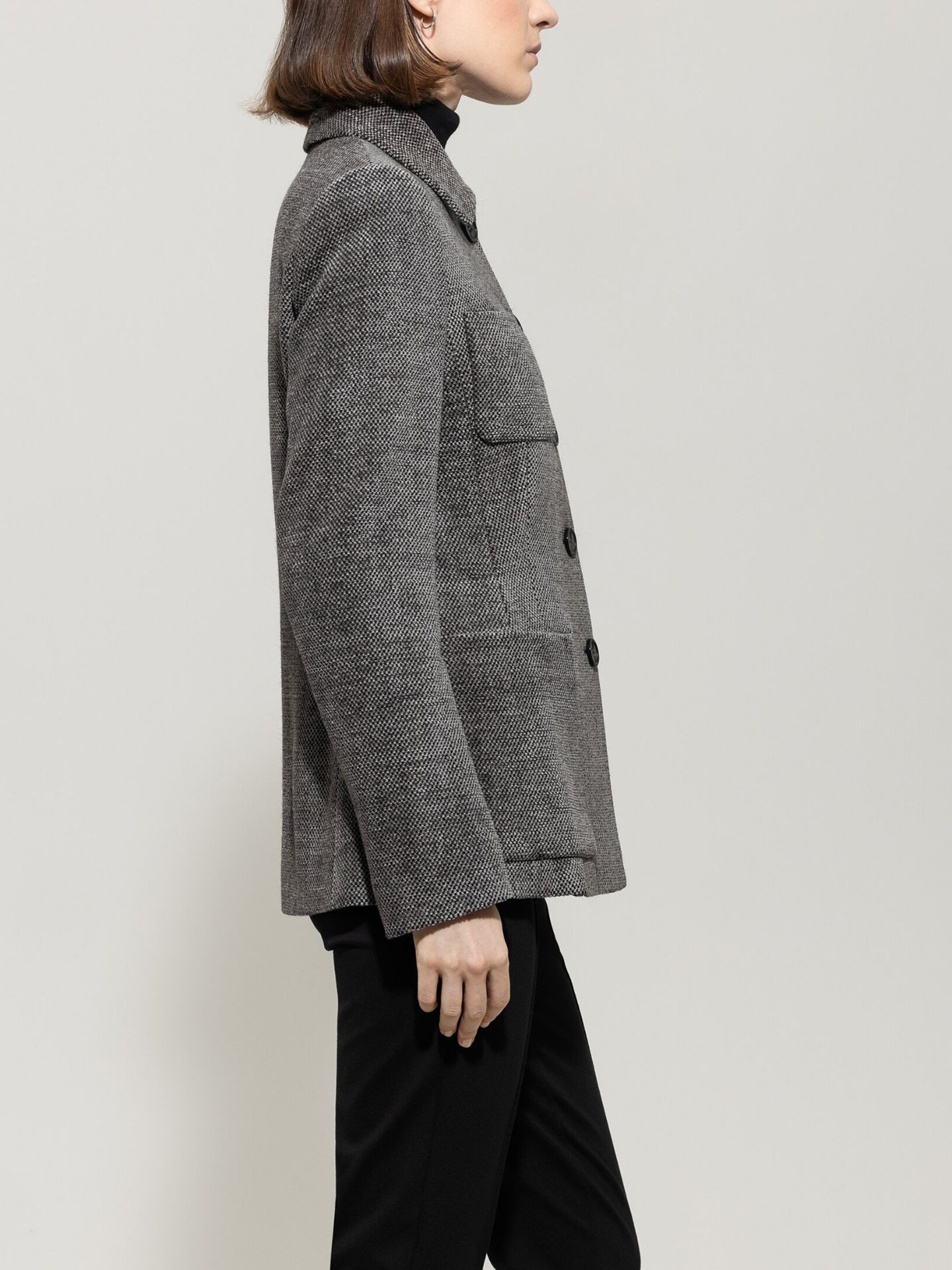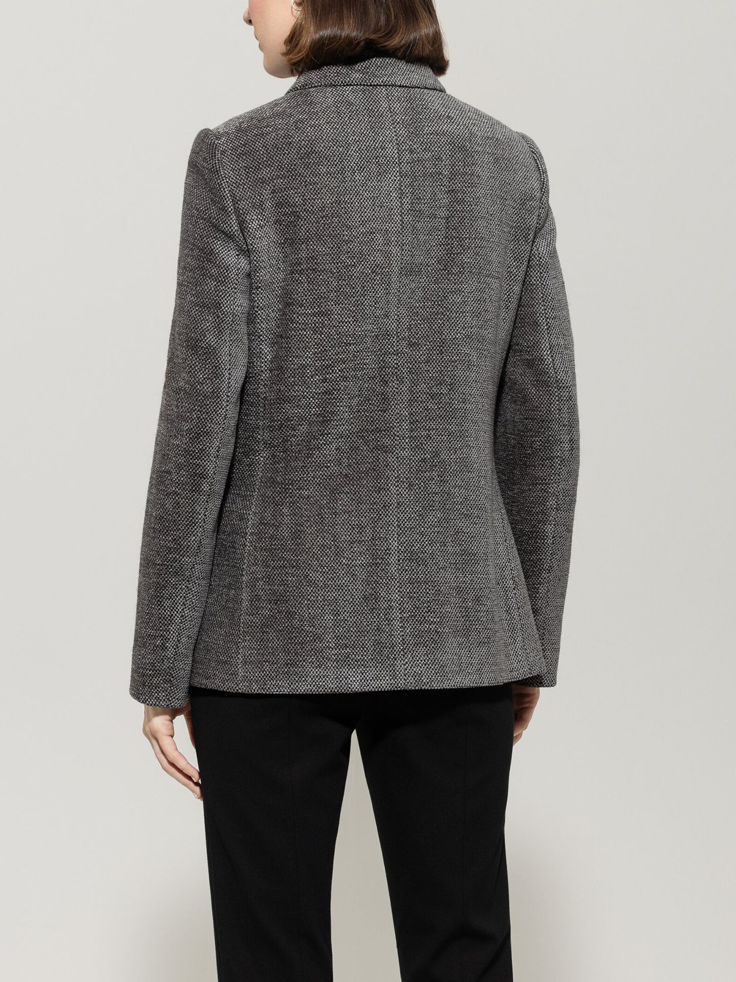 Langer Blazer in hochgeschlossenem Design mit vier großen, aufgesetzten Taschen. Der vollständig gefütterte Blazer wurde aus softer Chenille-Wolle in moderner Salz&Pfeffer-Optik gefertigt.