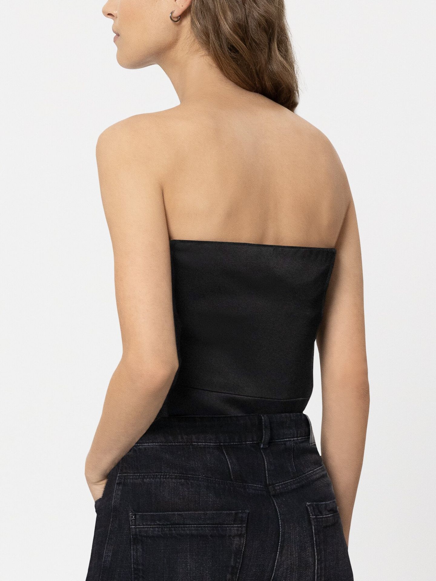 Ärmelloses Corsagen-Top aus Triacetat-Crêpe mit glänzender Satin-Außenseite und femininer Raffung an der Seite. Die Silikonbeschichtung am oberen Saum, das elastische Unterbrustband auf der Innenseite sowie der seitliche Reißverschluss sorgen für einen sicheren Sitz ohne Verrutschen.