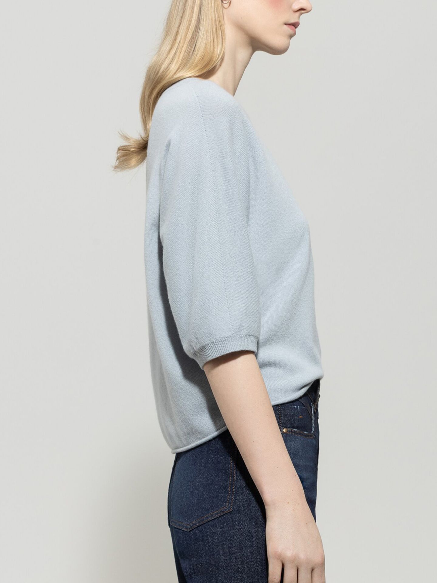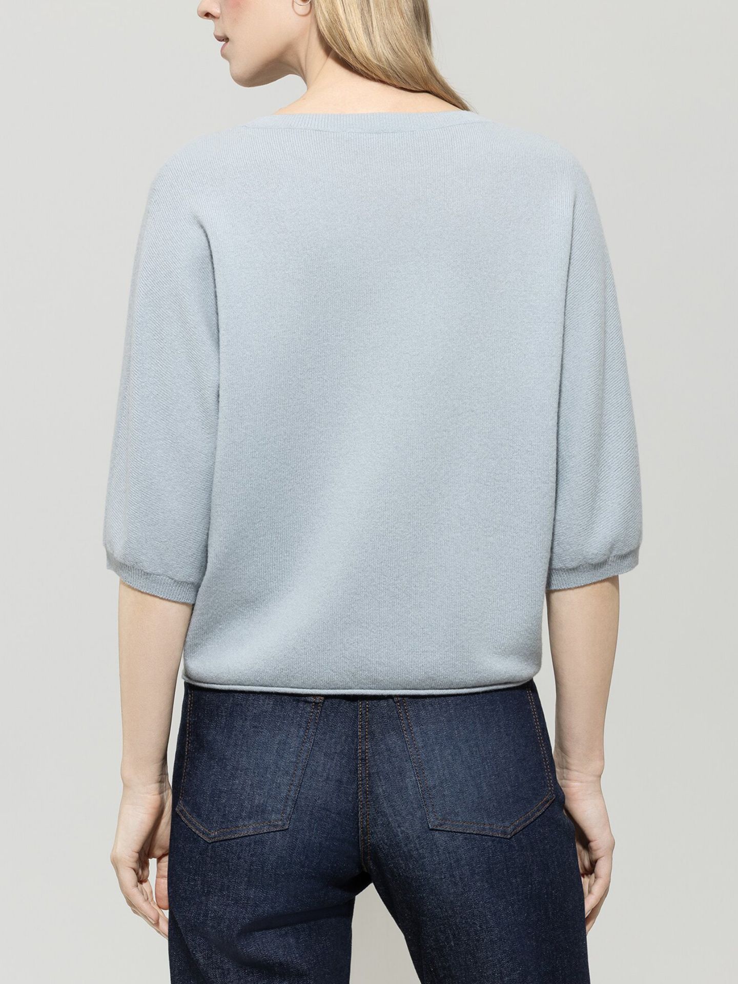 Kastig geschnittener Pullover aus edlem Kaschmir-Mix mit halblangen Fledermausärmeln und Rollsaum. Rundhalsausschnitt und Ärmel schließen mit Rippstrickbündchen ab.