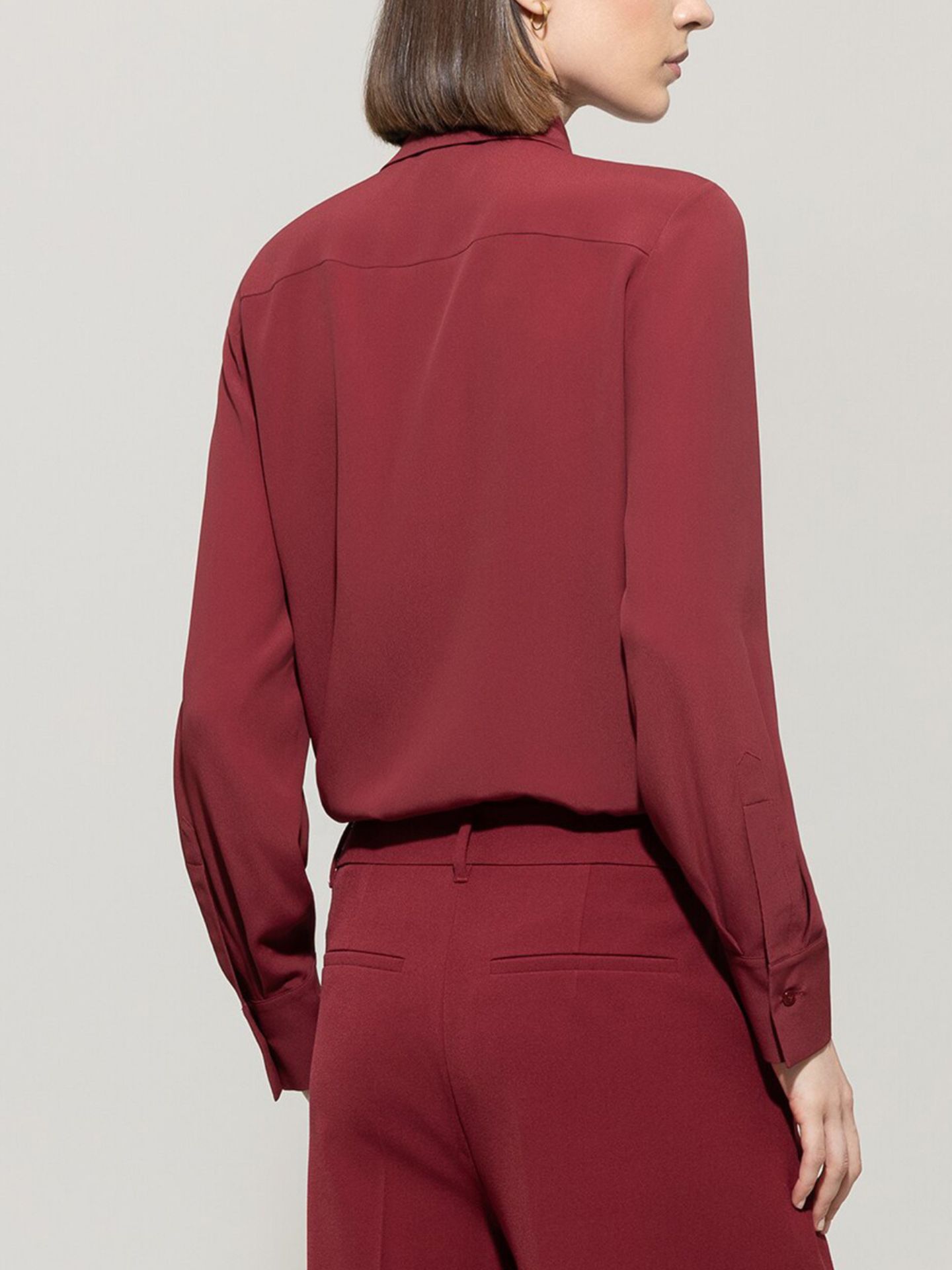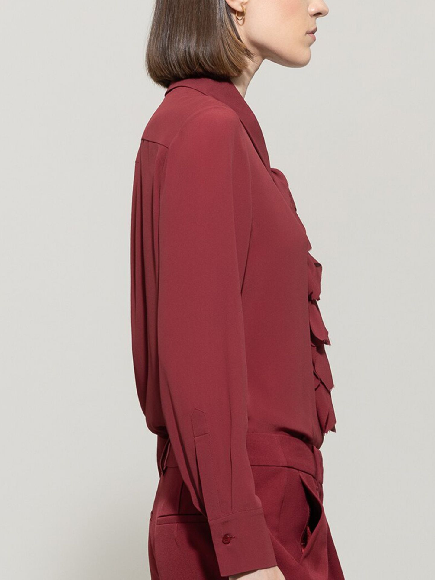 Hemdbluse aus einer schweren Seiden-Acetat-Mischung mit spitzem Hemdkragen und verdeckter Knopfleiste. Eine auffällige Schluppe mit Blätterrüschen ziert die Vorderseite.
