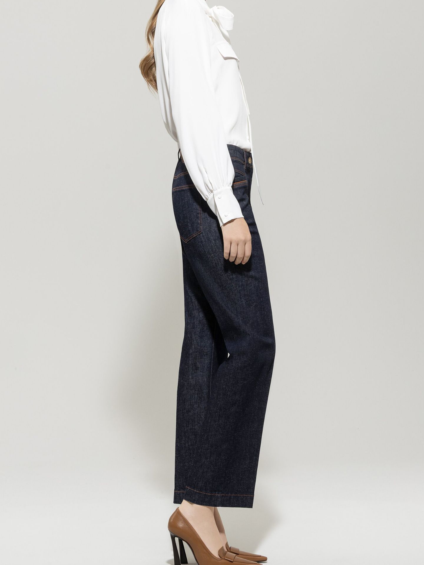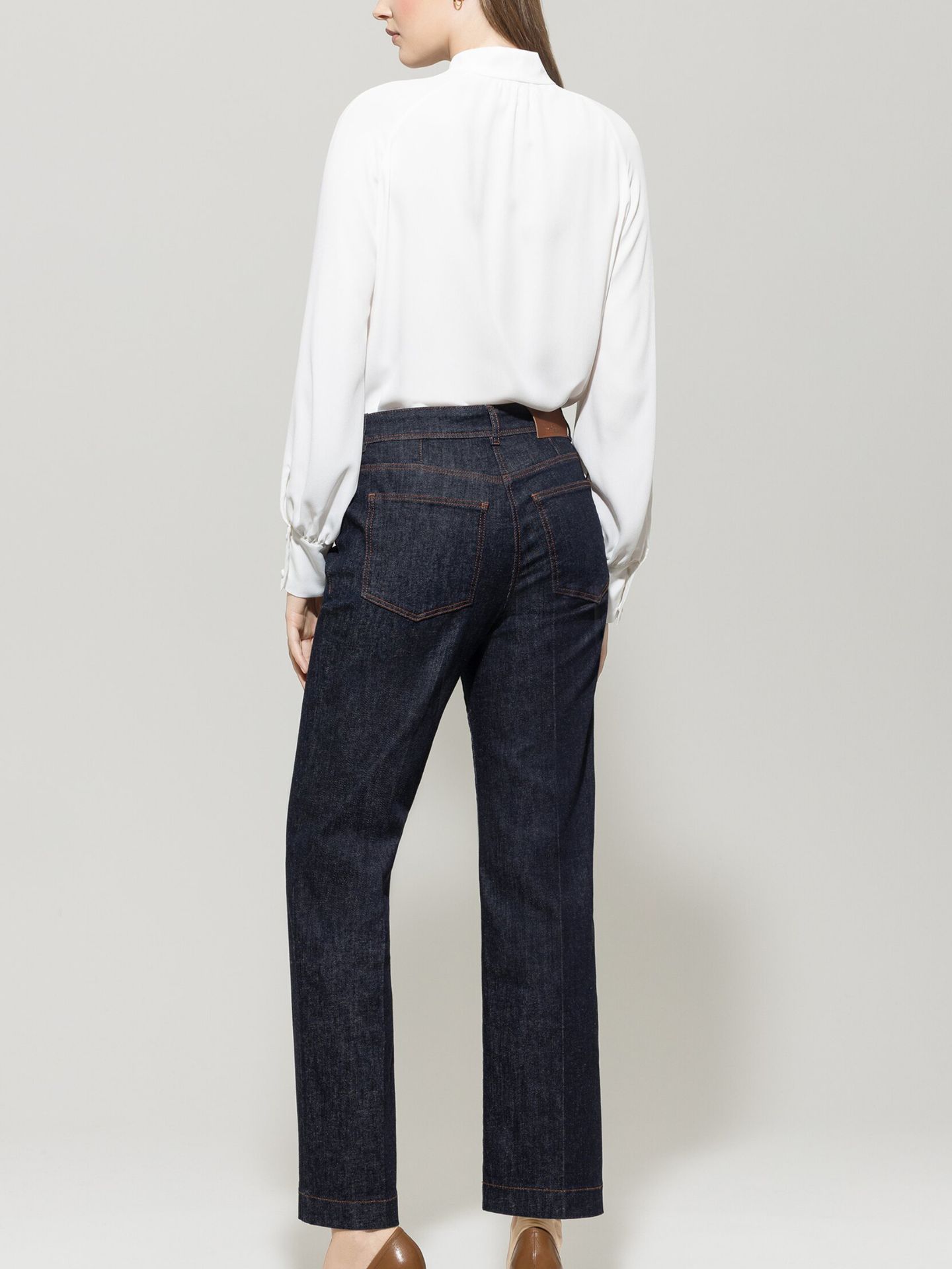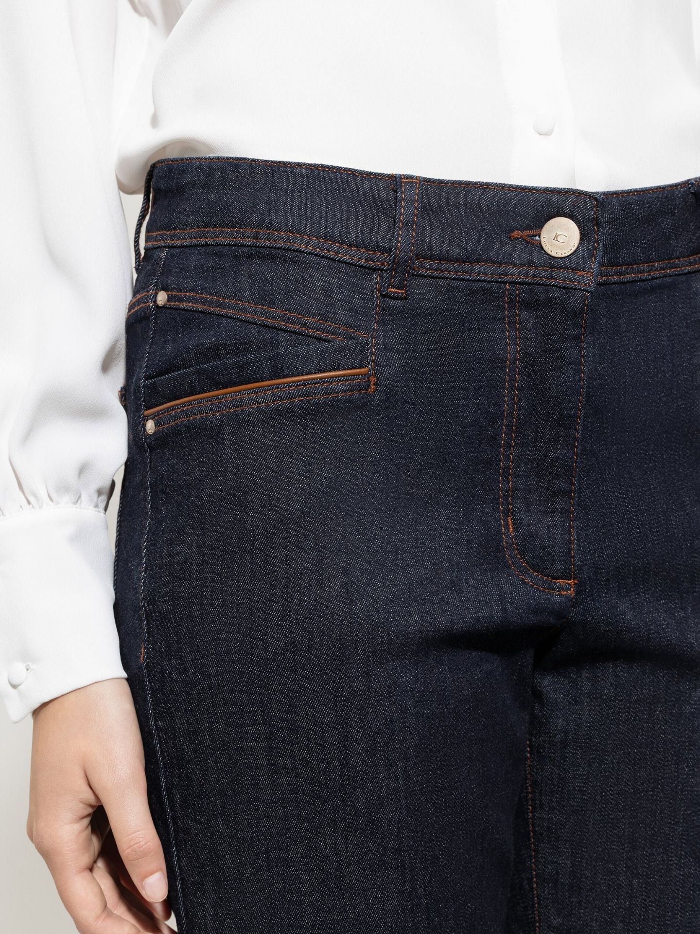 Gerade geschnittene Jeans mit Stretch-Anteil in Rinse-Wash-Optik. Farblich abgesetzte Nähte und Details aus echtem Leder verleihen der Hose einen besonderen Look. Die Hose hat einen Bund mit Gürtelschlaufen, zwei Eingriff- und zwei Gesäßtaschen.