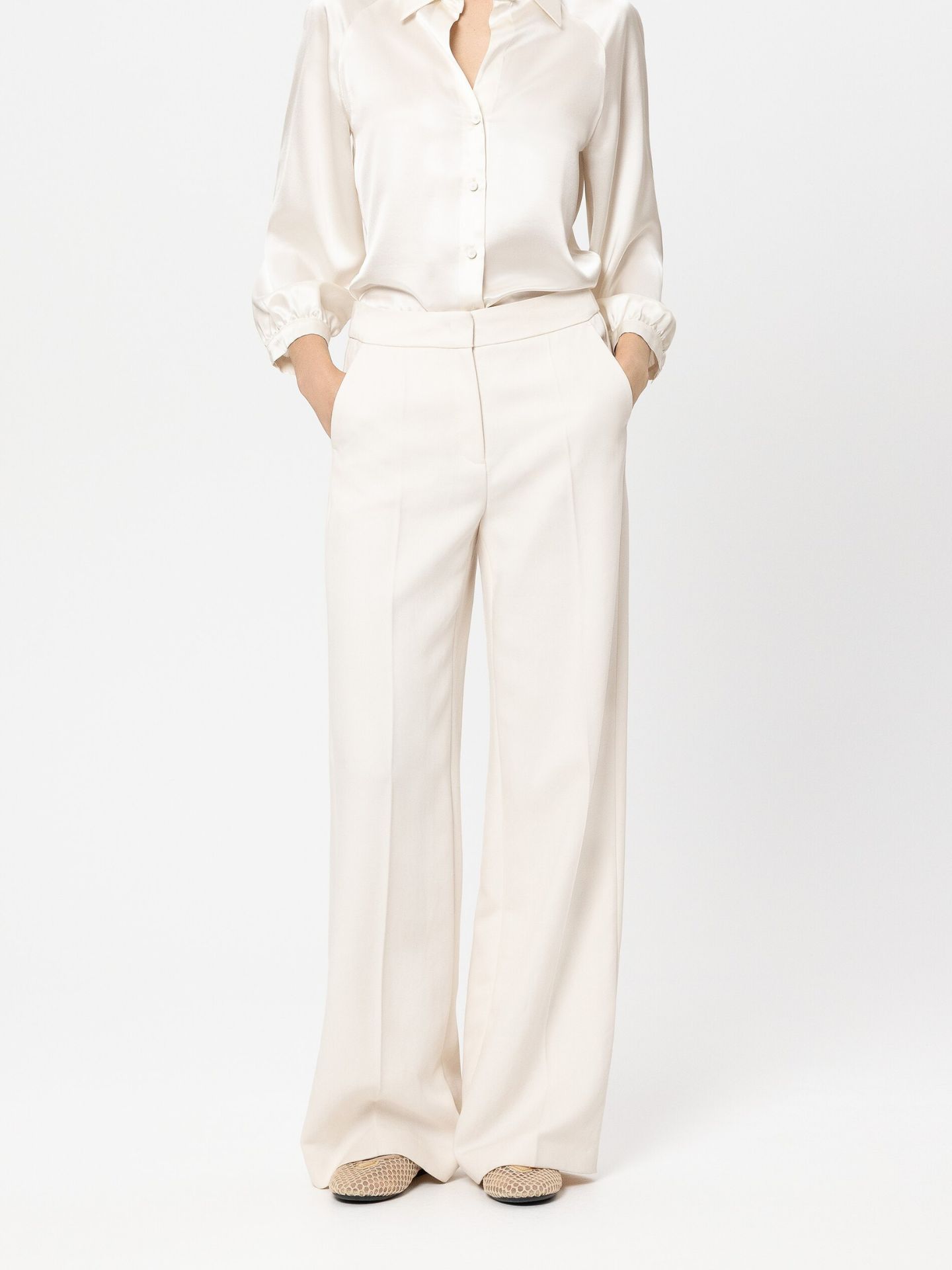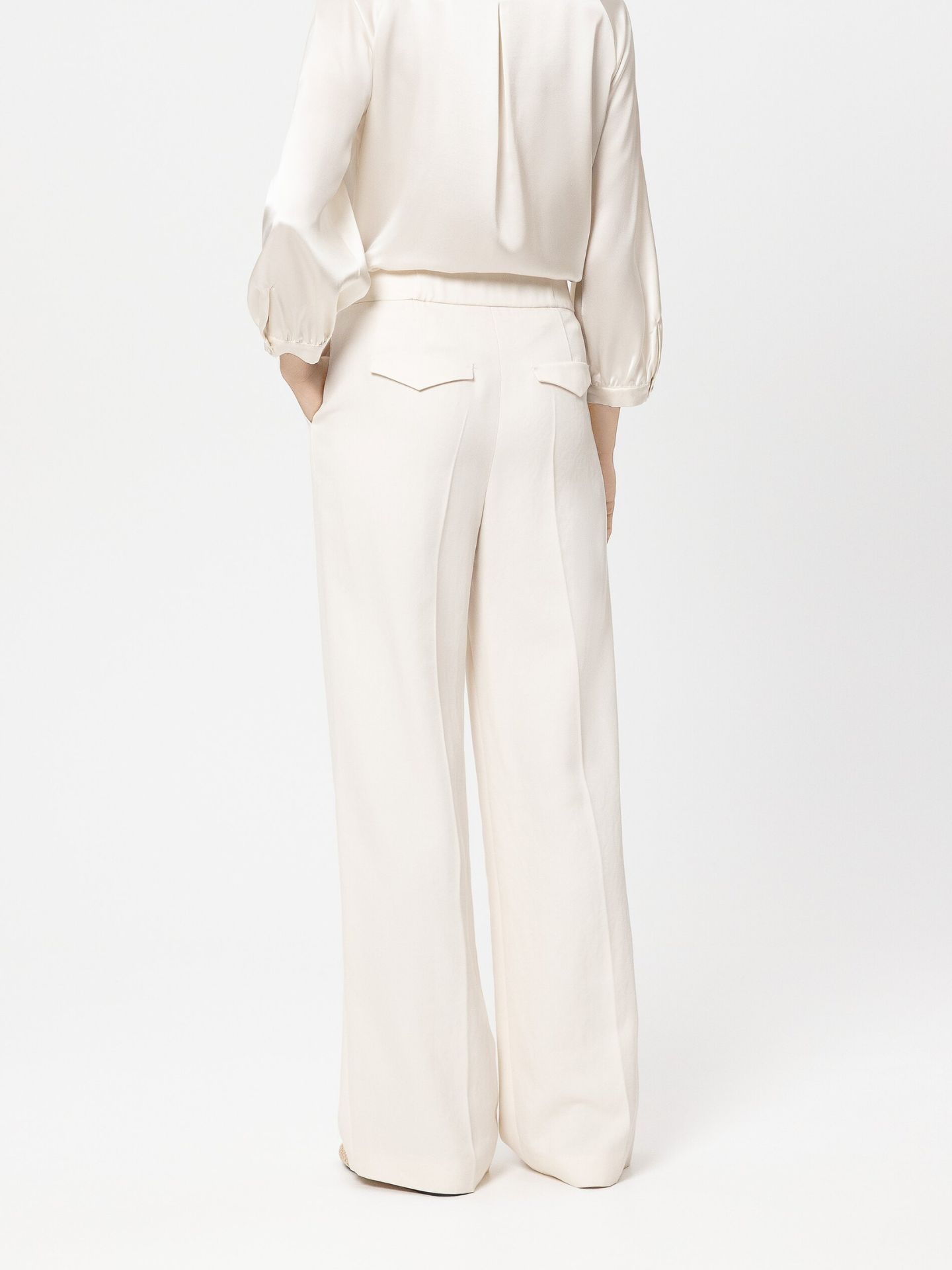Lang geschnittene Wideleg-Pants aus weich fallendem Twill-Gewebe mit Bügelfalten und zwei Eingrifftaschen. Auf der Rückseite sind zwei Fake-Pattentaschen zu sehen.